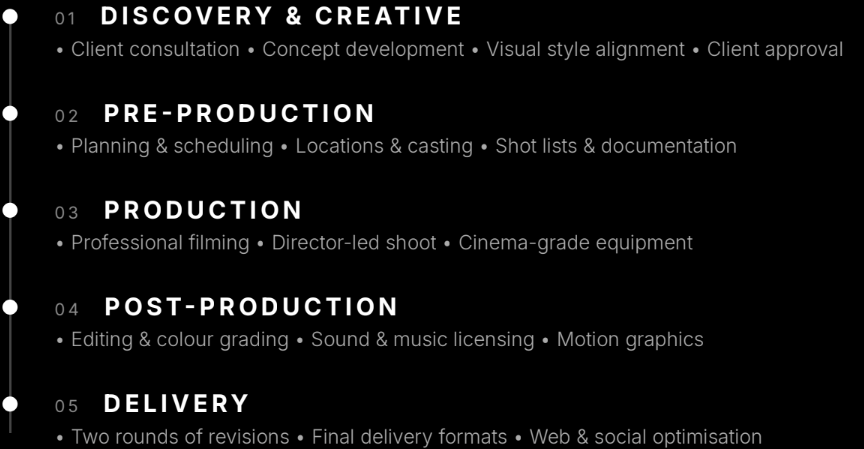 We provide a fully managed production service, overseeing every stage of the process—from initial concept development through to final delivery—to ensure each project is executed to the highest professional standard. Our promotional videos are designed to capture attention, elevate brand perception, and help businesses stand out in competitive digital environments.